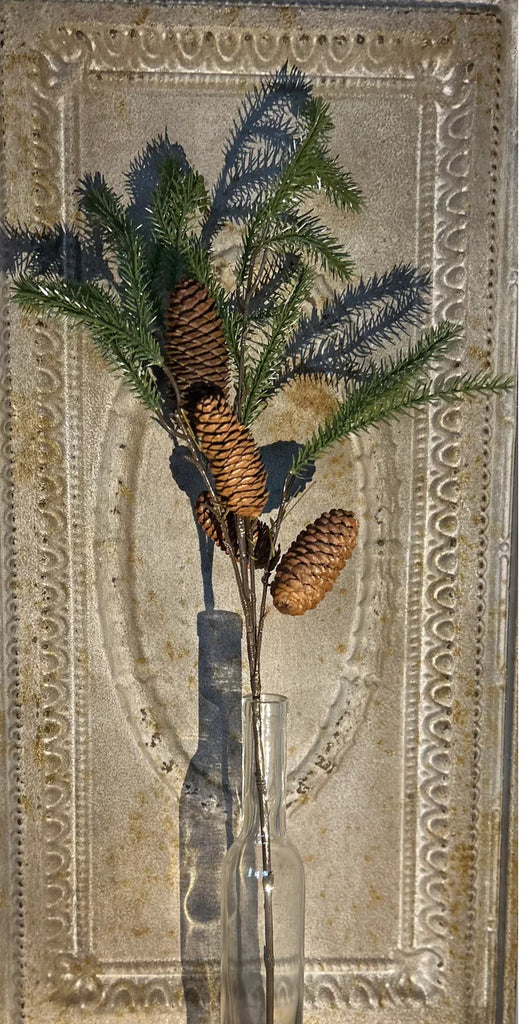 Mooie groene kunst tak met vier dennenappels!om je huis mee te stylen, in vaas, op de schouw, op tafel,