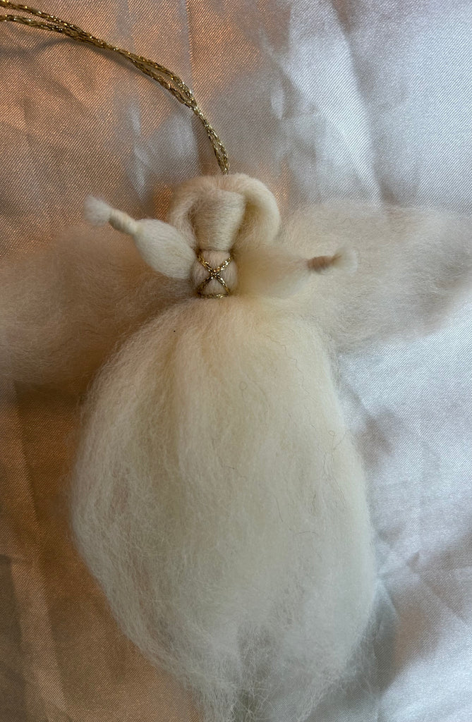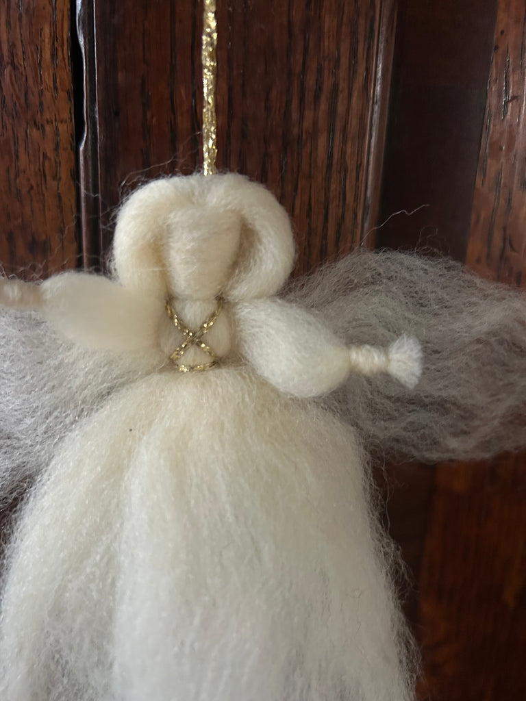 Een engel van witte wol met gouddraad om op te hangen, prachtig in al haar eenvoud!