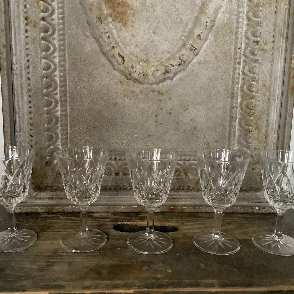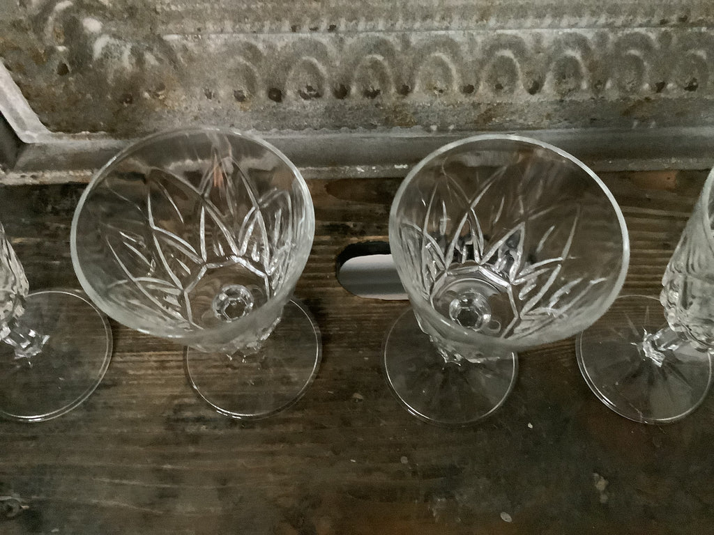 Vijf kleine bewerkte glaasjes op zeshoekige voet, voor een portje, op de gedekte tafel met theelichtje/bloemetje.