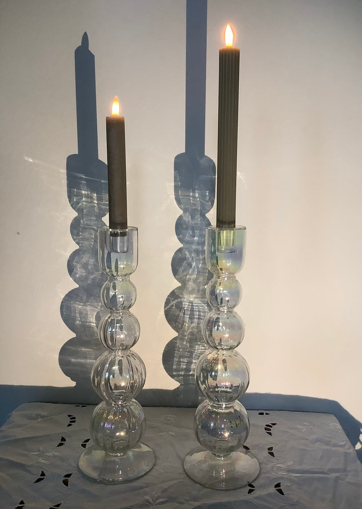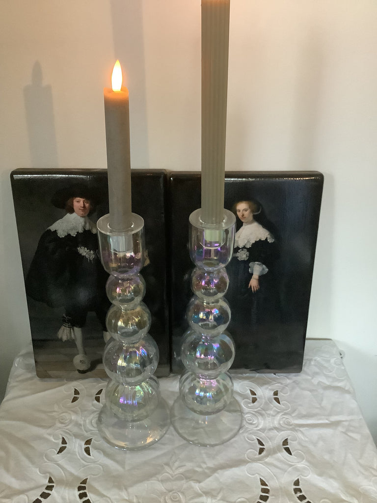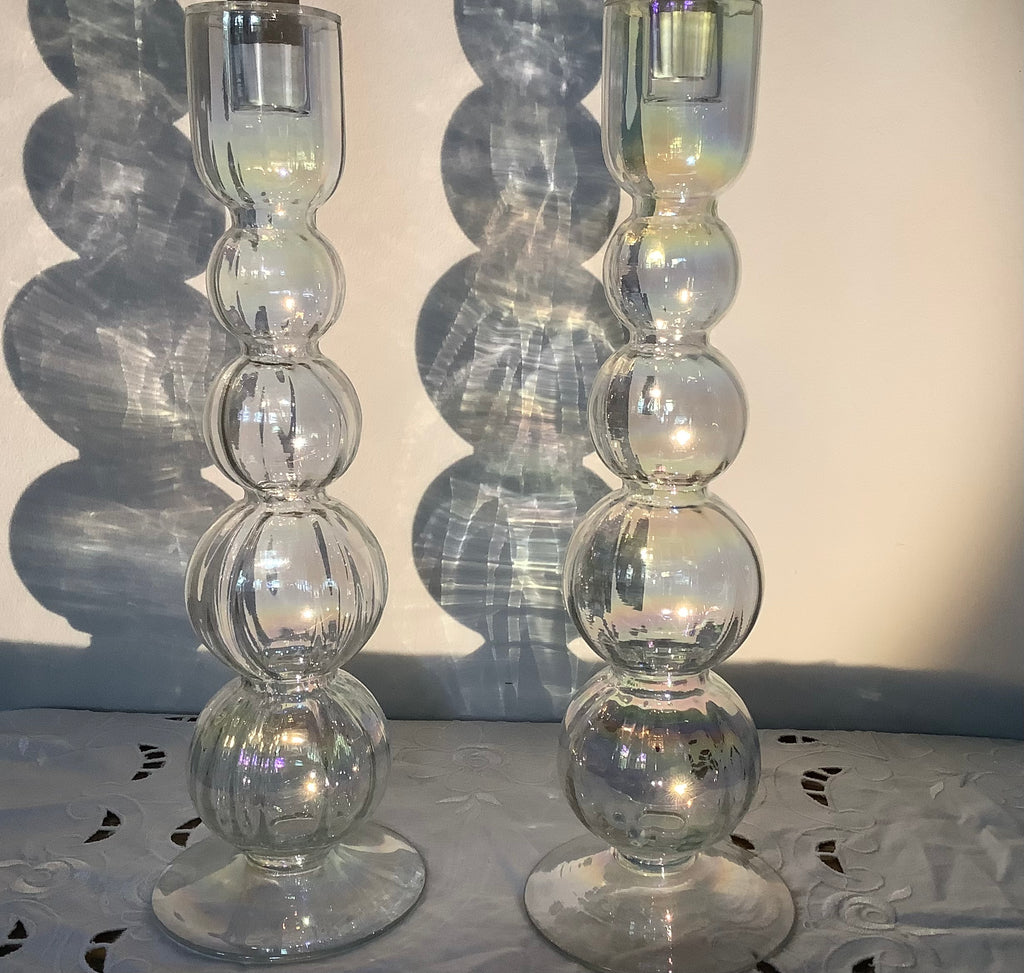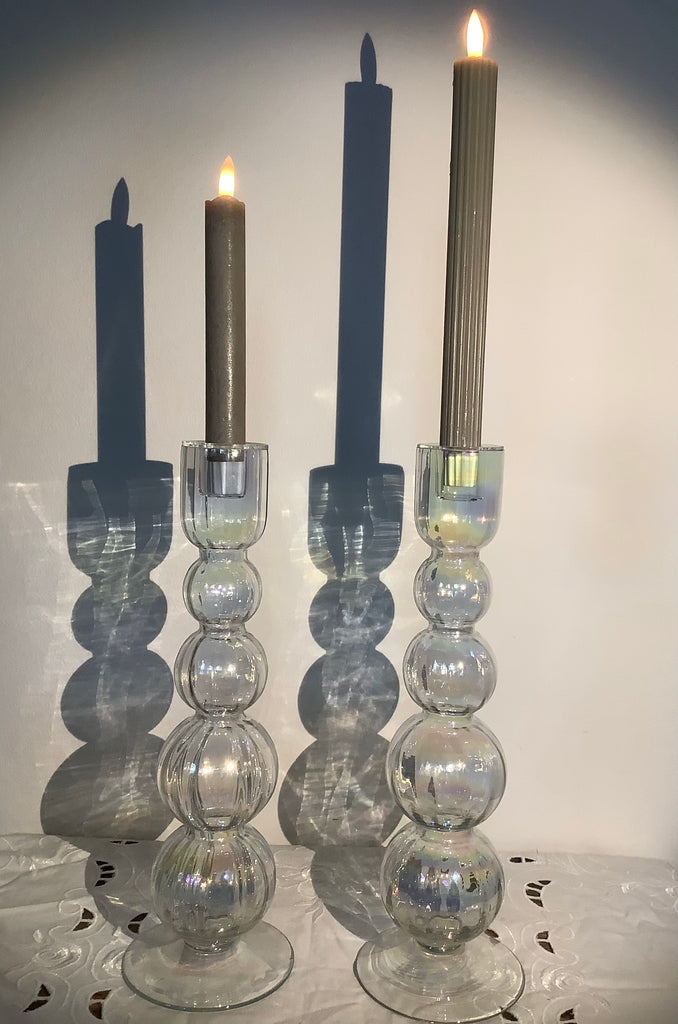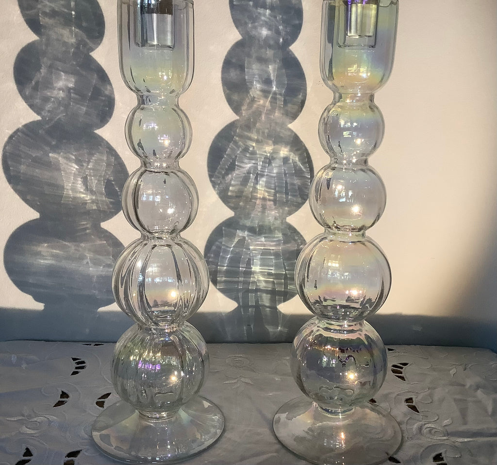Prachtig vormgegeven hoge glazen kandelaars met gesloten opening zodat ev kaarsvet er niet in kan druppelen. Mooie “olie”tinten in het geribbelde glas.