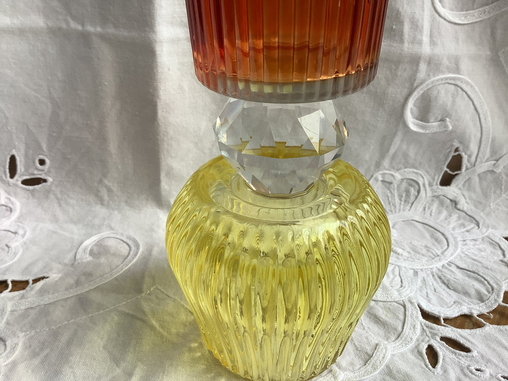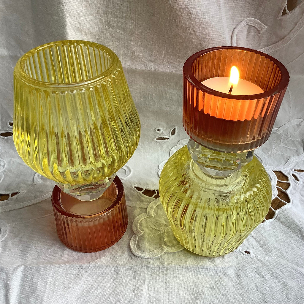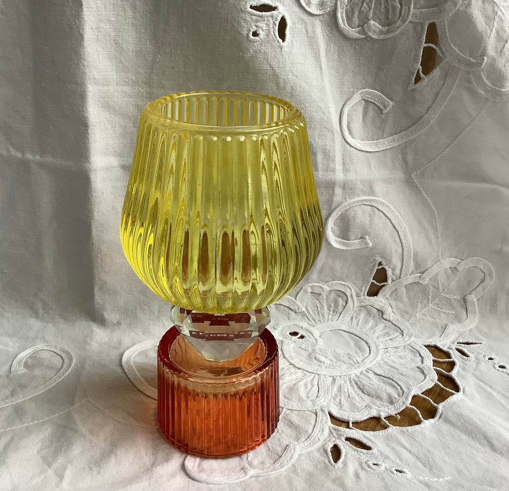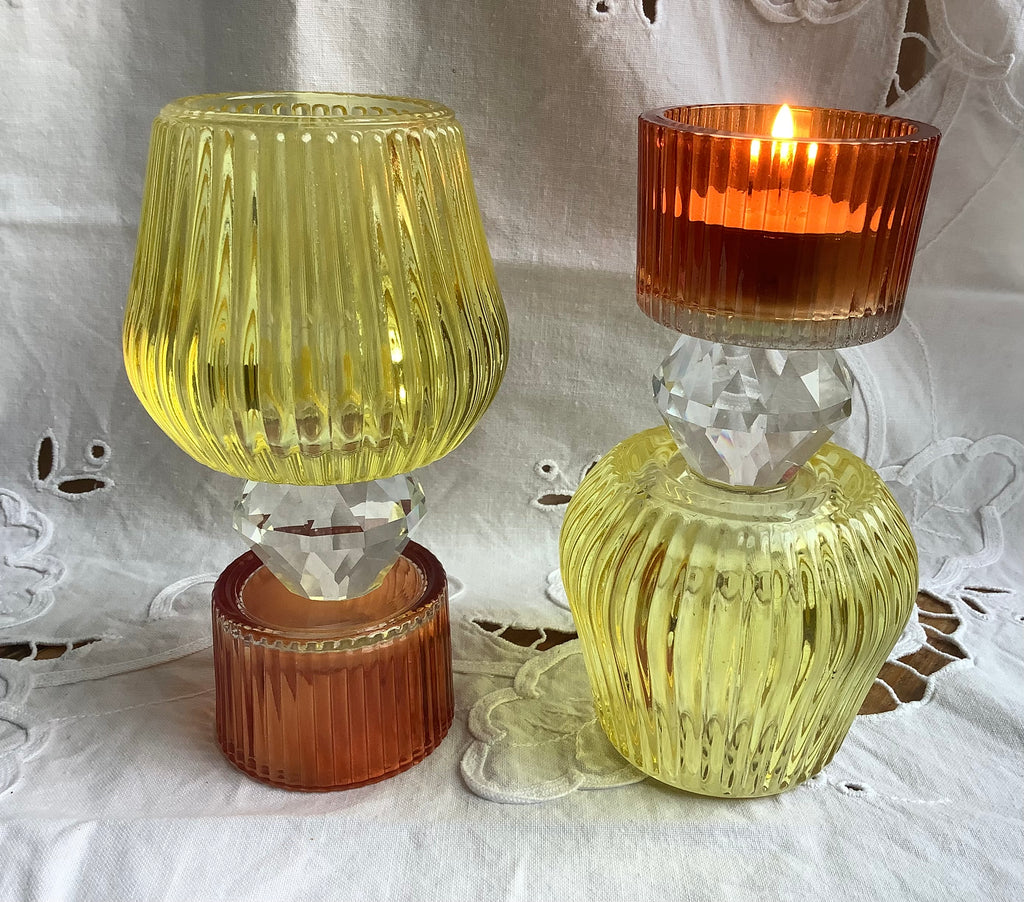 Aan beide zijden te gebruiken (waxinelicht), deze sierlijk vormgegeven glazen kandelaar, een roestbruine bovenkant óf een gele! In het midden een facet geslepen “diamant” van doorzichtig glas.