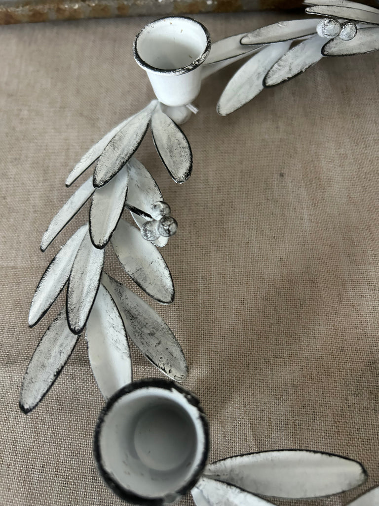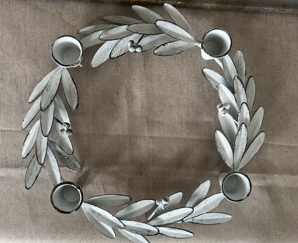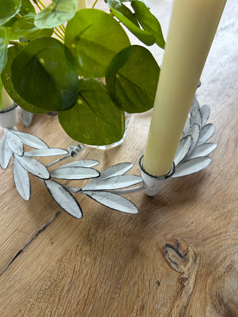 Elegante witte vintagelook ronde kandelaar voor 4 kaarsen met in t midden ruimte voor groendecoratie. Meteen een aangeklede tafel!25cmØ