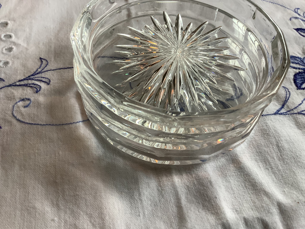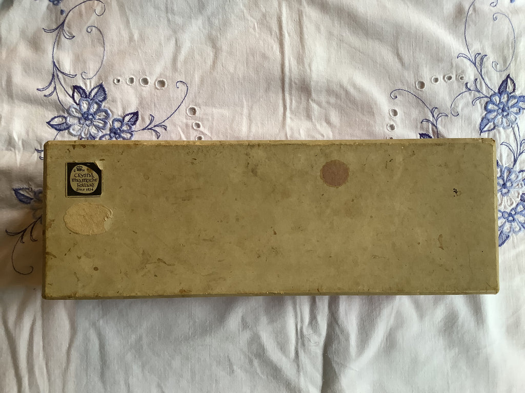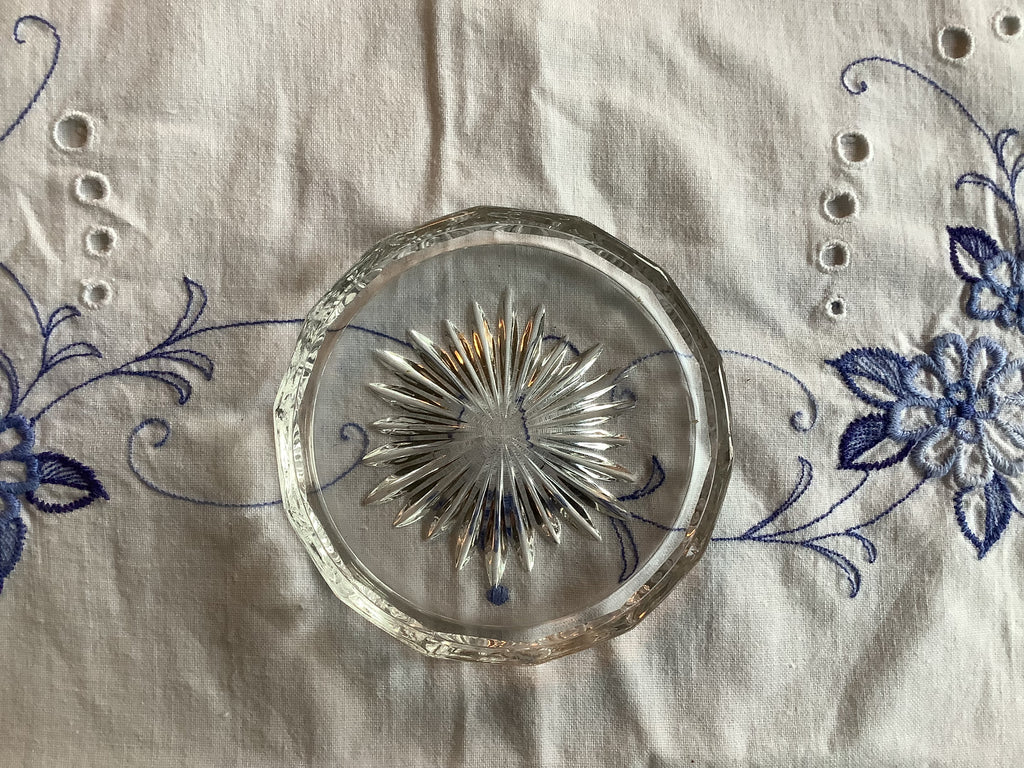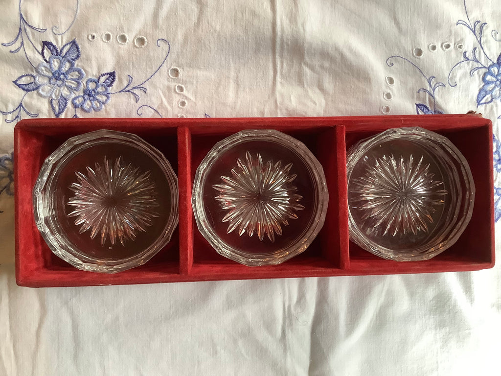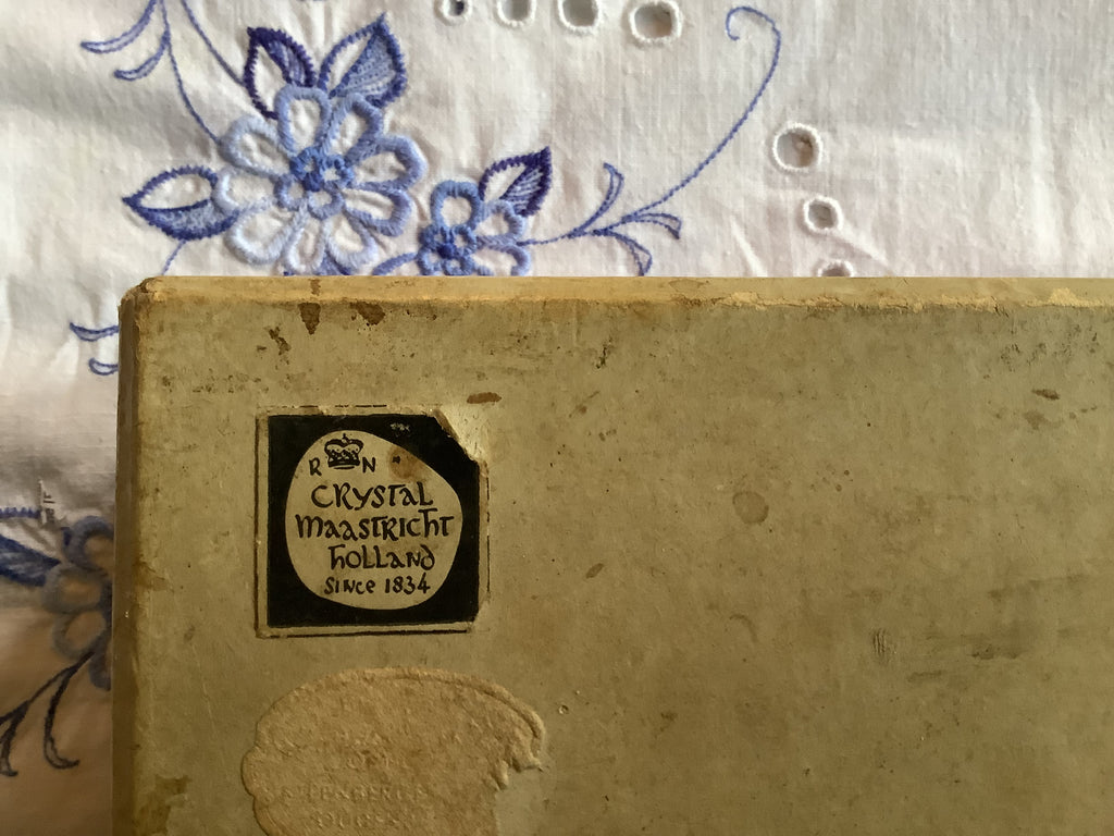 9 puntgave kristallen onderzetters in originele doos (deze heeft gebruikssporen aan de buitenkant) van de Nederlandse kristal unie Maastricht.