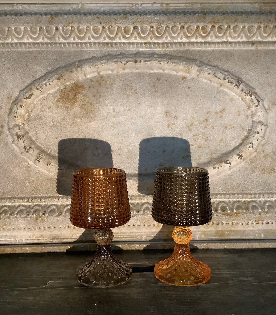Bewerkt dik glas. , mooi in combinatie met t andere lichtje met oranje/roestbruine voet.