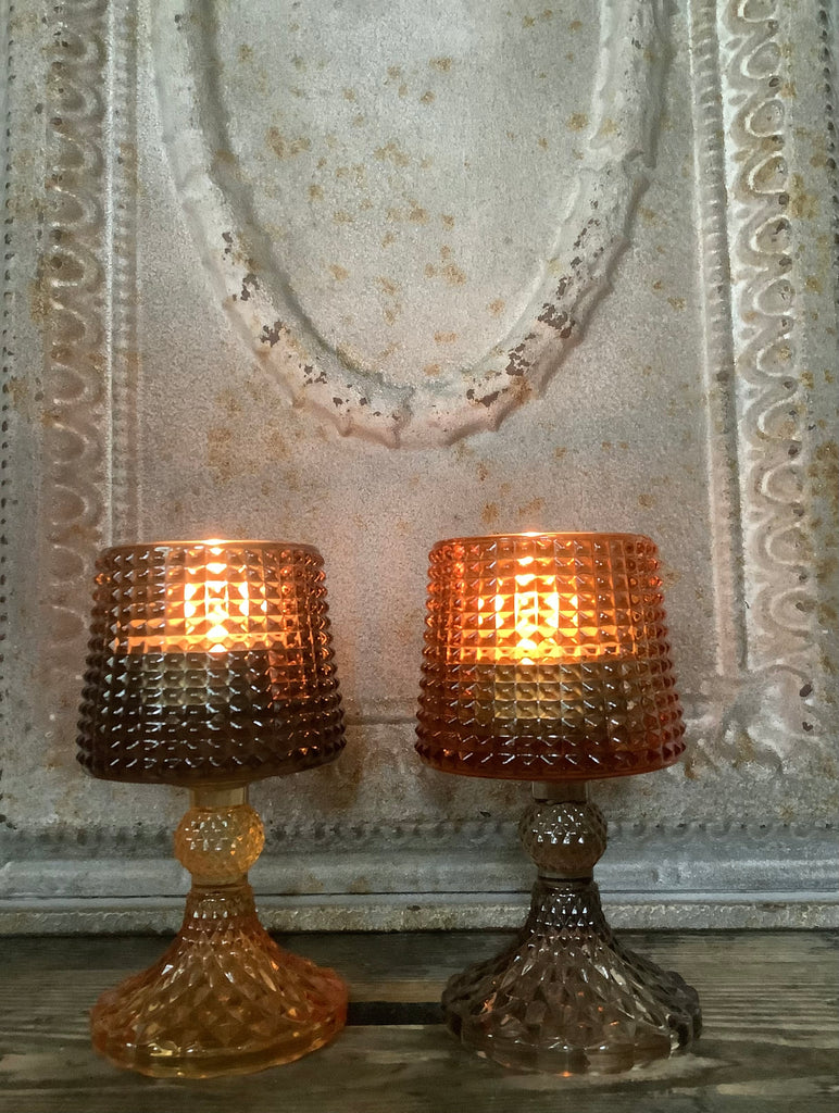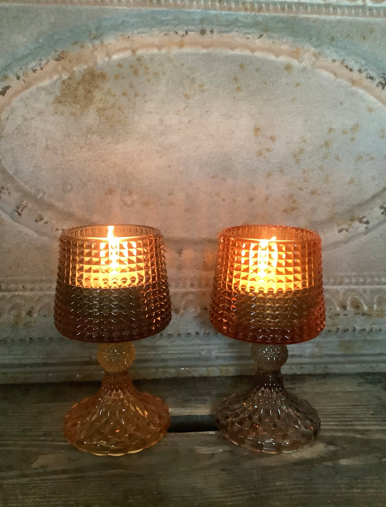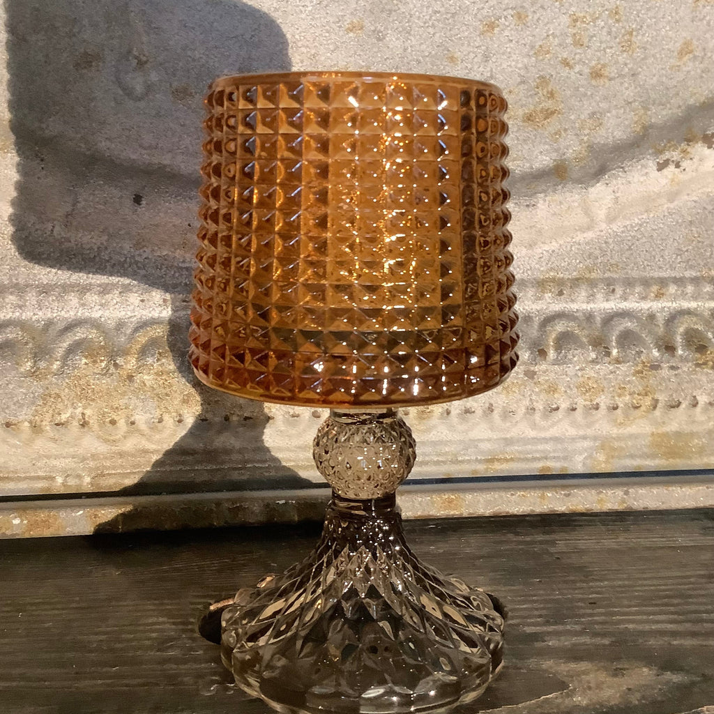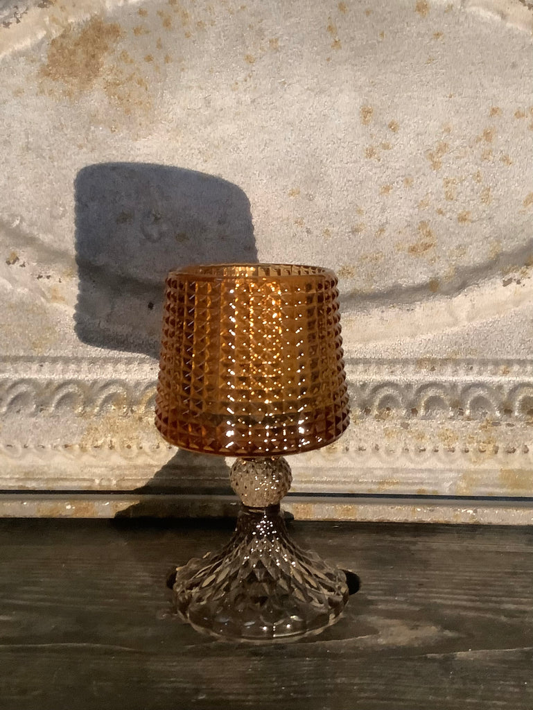 Sfeerlicht/waxine lichthouder in de vorm van “lampje”, in najaarstinten, roestbruin en brons.