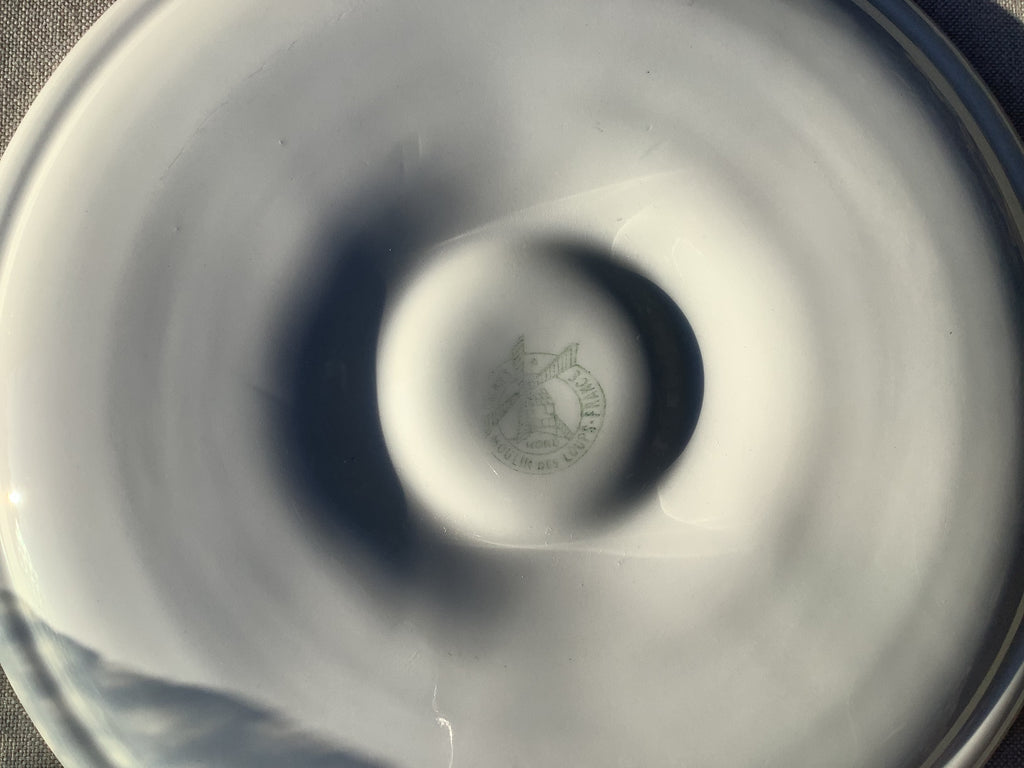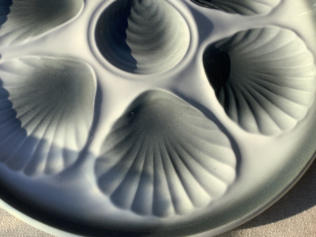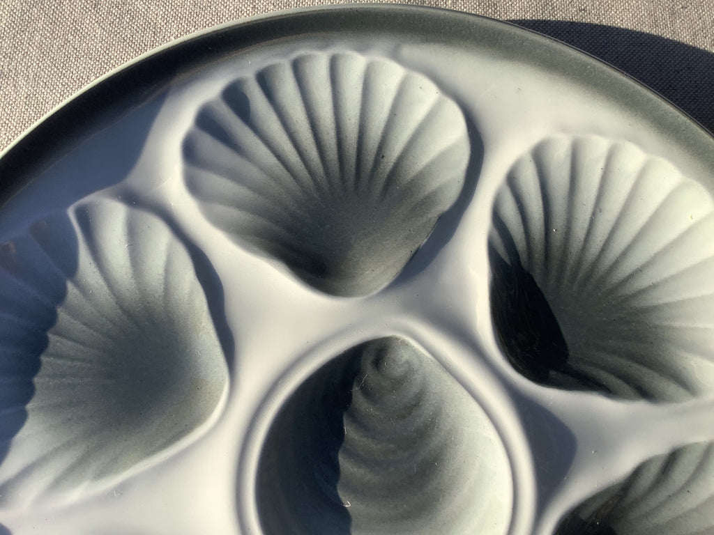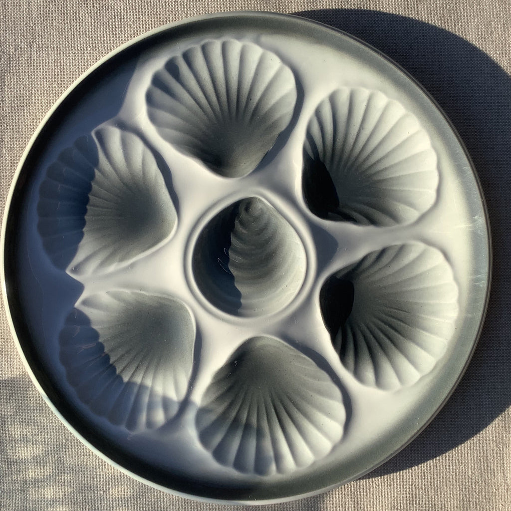 Aardenwerk oesterbord met schelpmotief in grijstinten, gemaakt door faiencerie Moulin des loups in Orchies, Noord Frankrijk