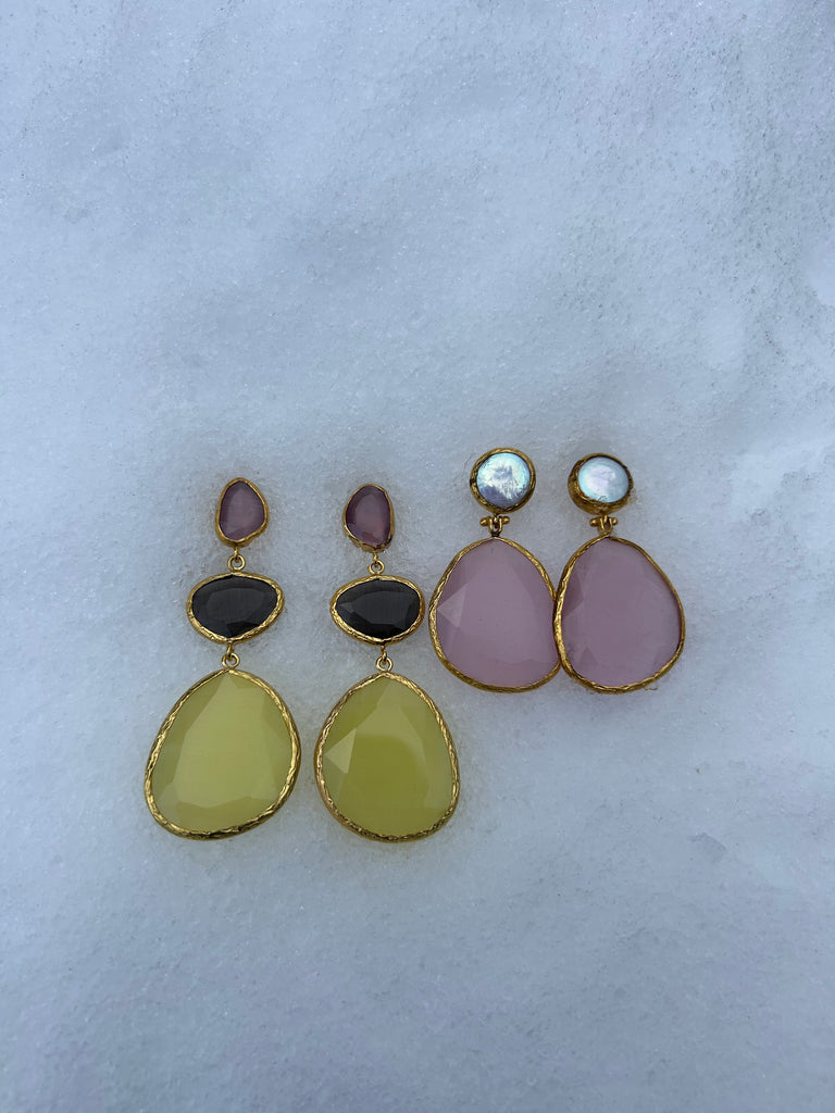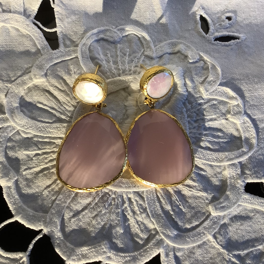 Elegante Oorbellen van 24K verguld messing , met parelmoer en oudroze facetgeslepen steen.