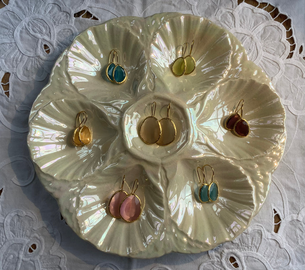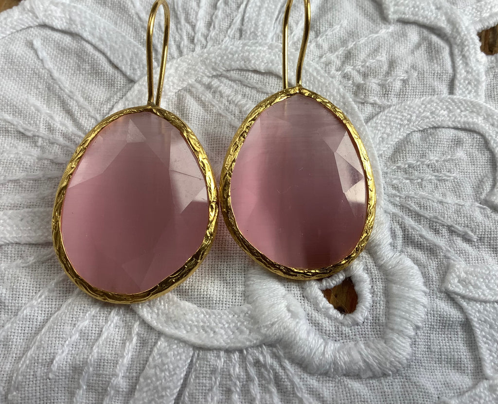 Prachtige 24k verguld messing oorbellen met roze cateye-steen. Op de laatste foto is het verschil goed te zien met maatje kleiner(s)