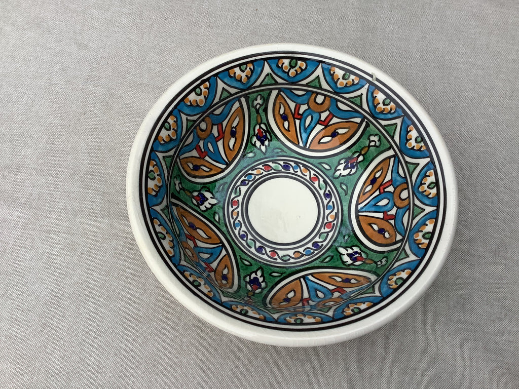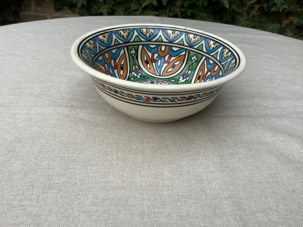Schaal uit Tunesië met “rand” , handbeschilderd, ook aan de buitenkant. Fijne maat voor salades, óf wokgerechten.