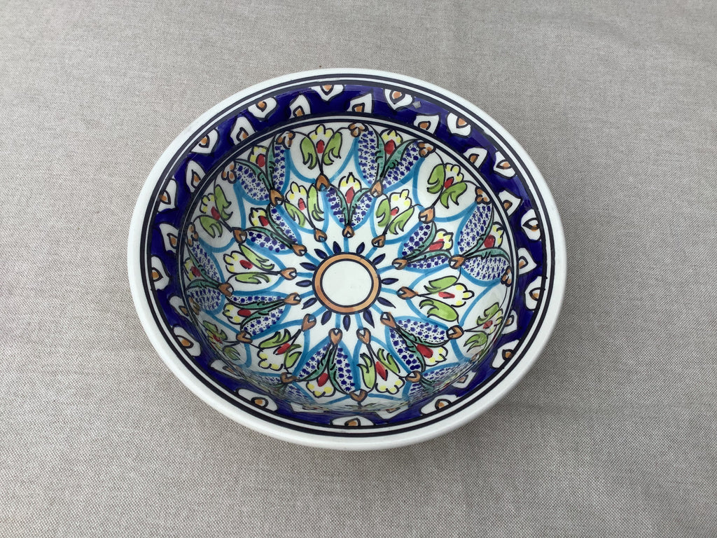 Schaal uit Tunesië met “rand” , handbeschilderd, ook aan de buitenkant. Fijne maat voor salades, óf wokgerechten.