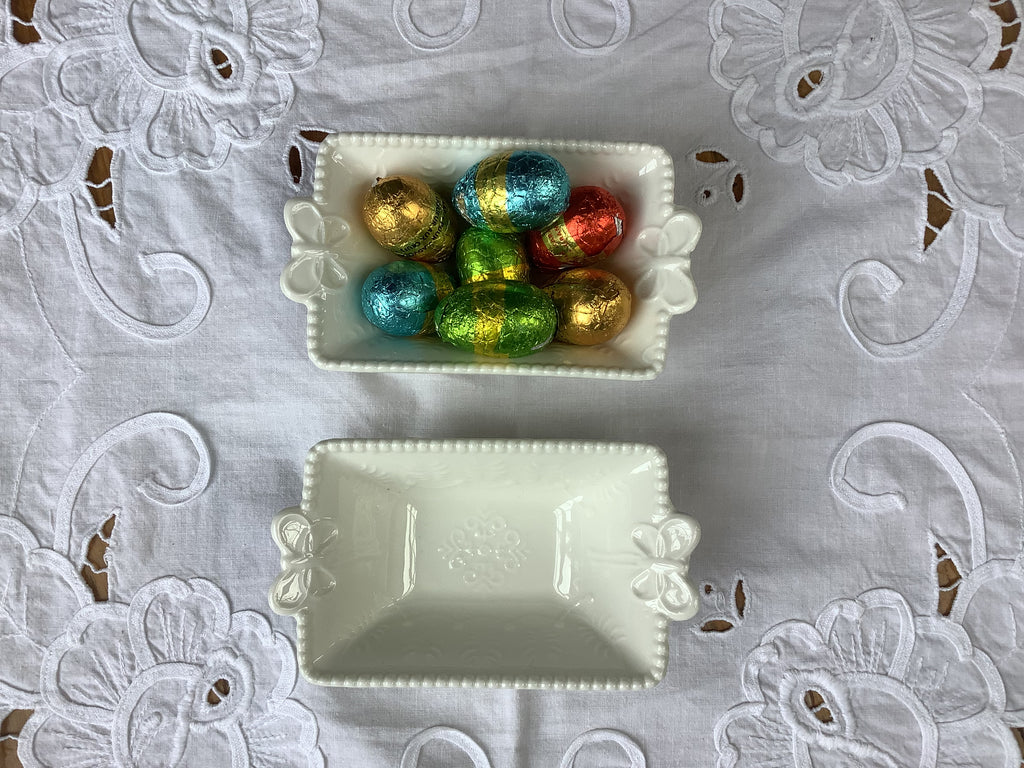 Porseleinen gebroken wit klein schaaltje/bakje met parelrand en vlindertjes aan de kopse kant. Past bij elk servies. Leuk bv, om bij ieder bord als side gerechtje te gebruiken. Of als toetjes schaaltjes, voor chocolaatjes, koekjes, kortom multifunctioneel!