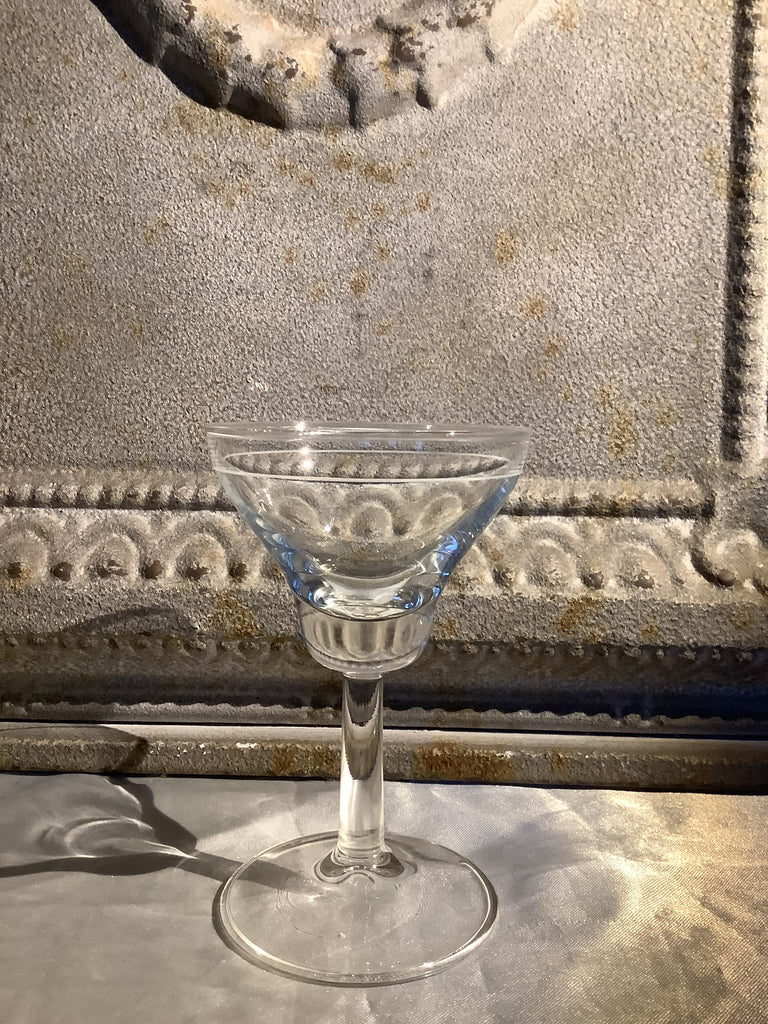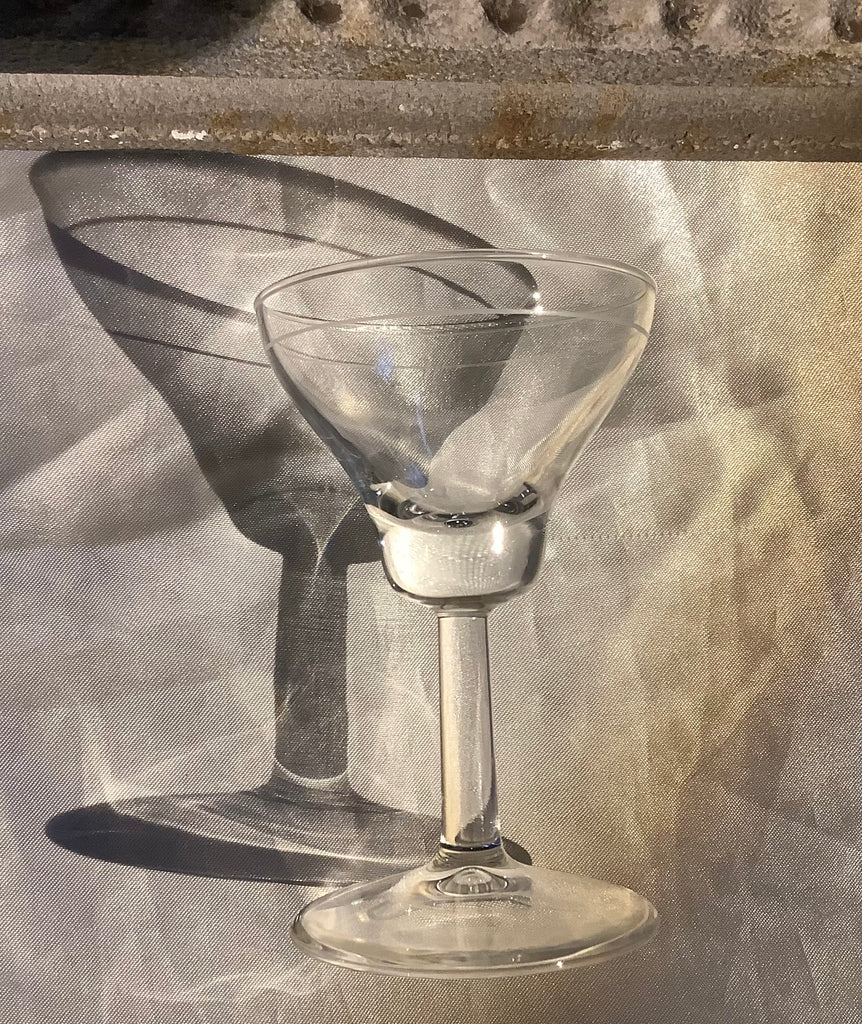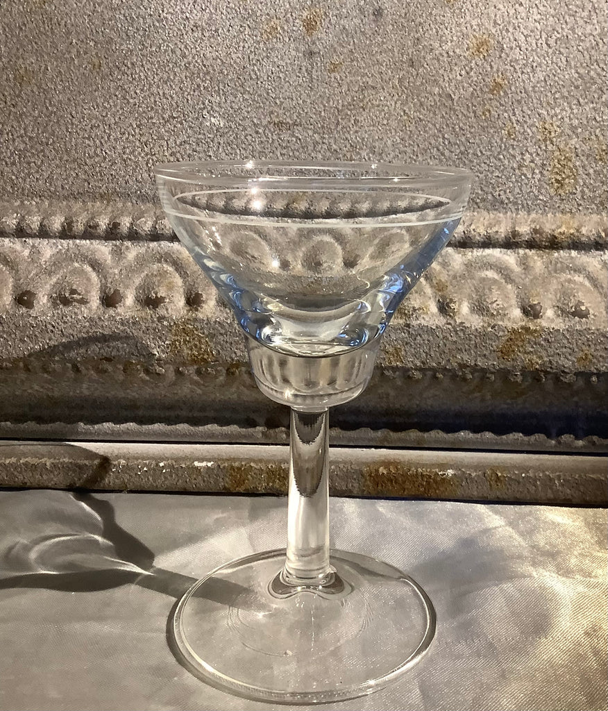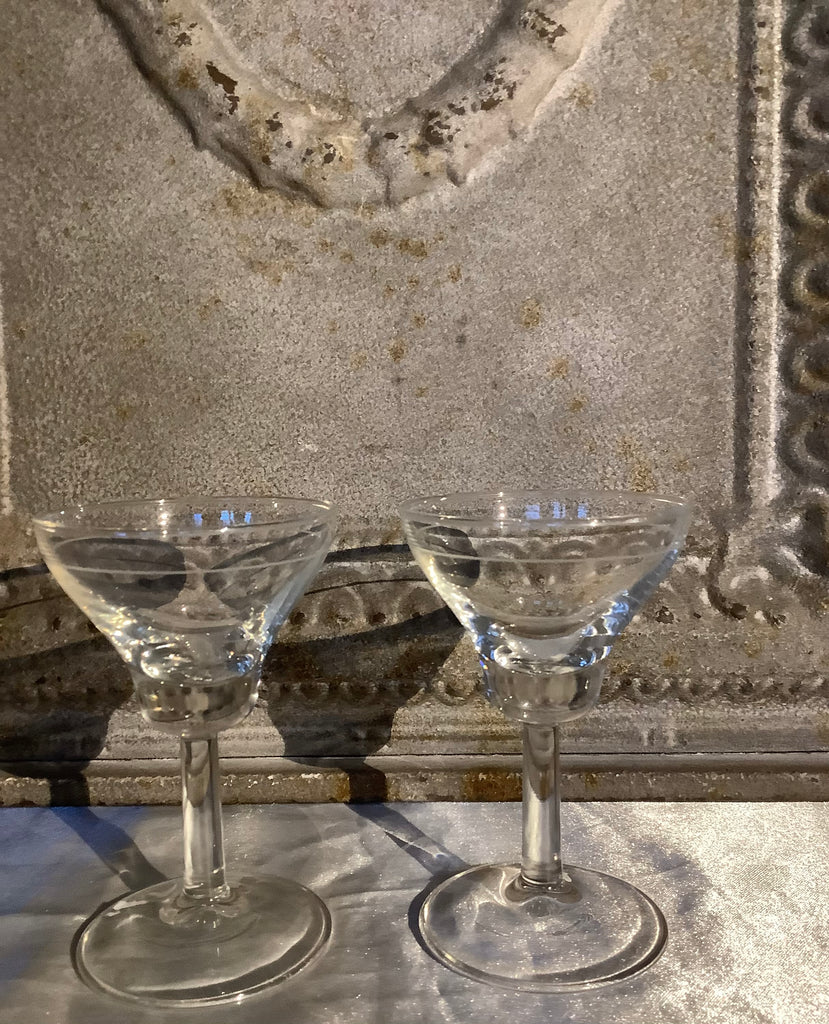 Puntgave set borrelglaasjes, op hoge voet en gegraveerde lijn in kelk.