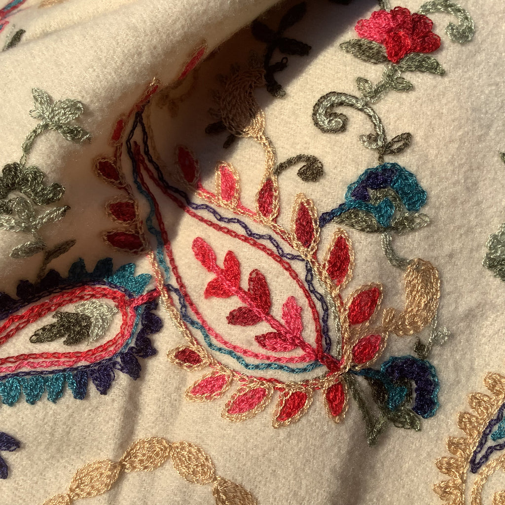 Een superzachte feestelijke gebroken witte shawl met daarop geborduurde bloemen en motiefjes in allerlei kleurtjes. Een echte blikvanger wanneer je deze draagt!