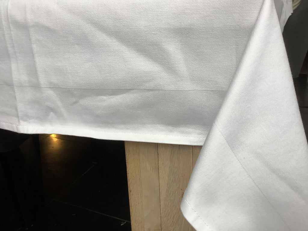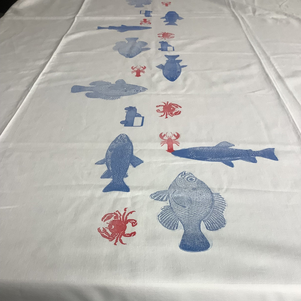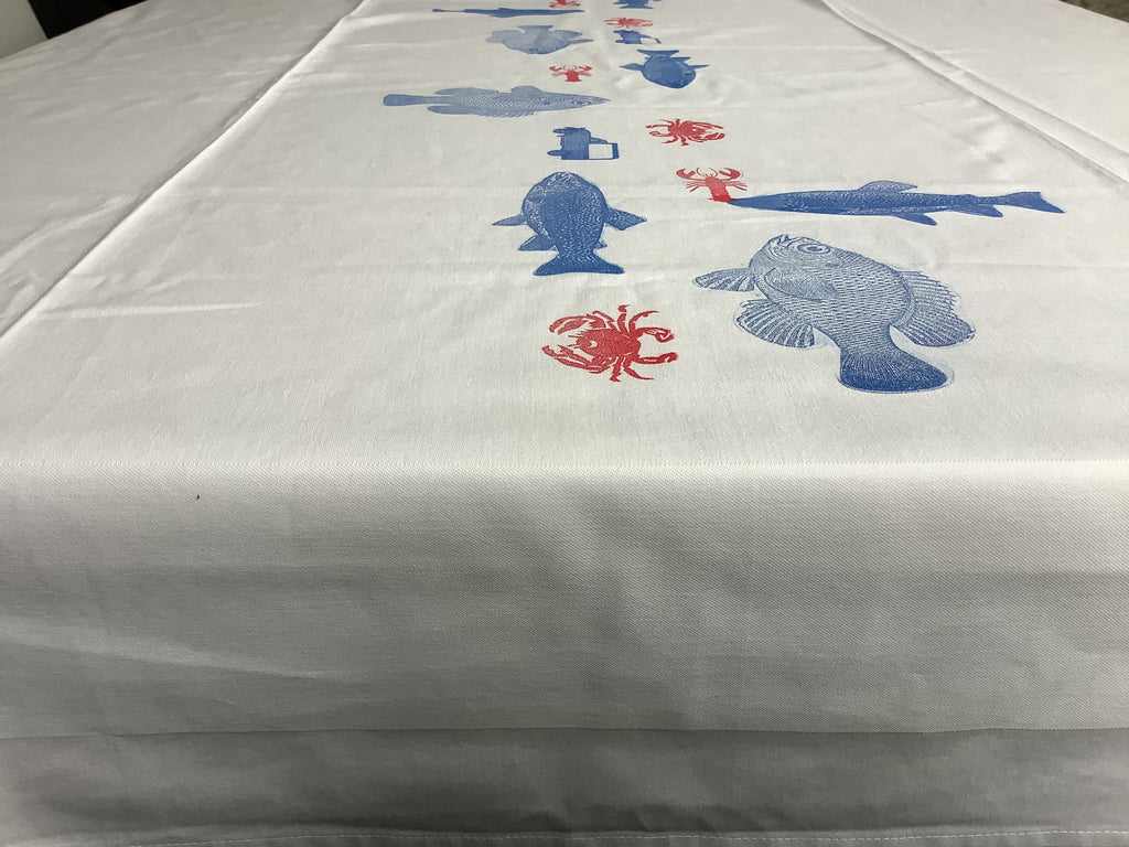 Uit eigen atelier,dit damasten witte kleed met ingeweven rand, waarop in het middenstuk vnl vissen gestempeld zijn en hier en daar een deux cheveaux bestel als creatieve knipoog.