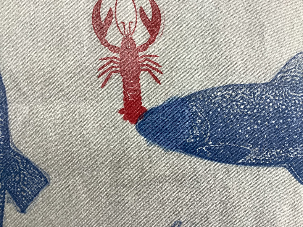 Bij een vis is de inkt wat doorgelopen, (laatste foto) daardoor is de prijs van dit kleed “leuk”:)