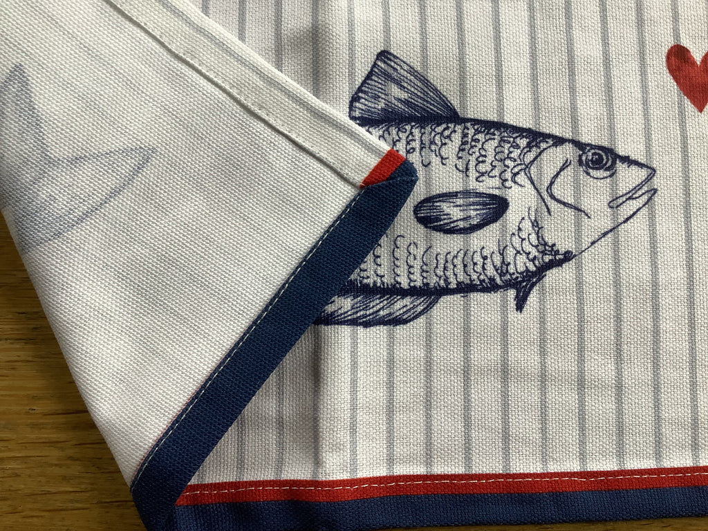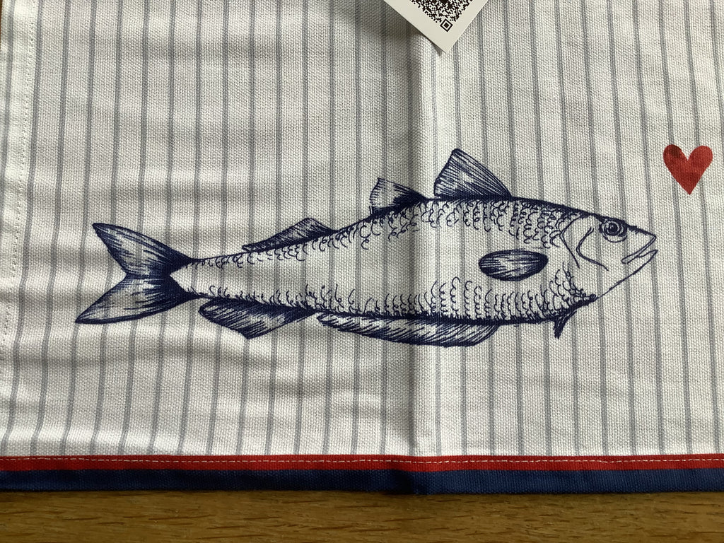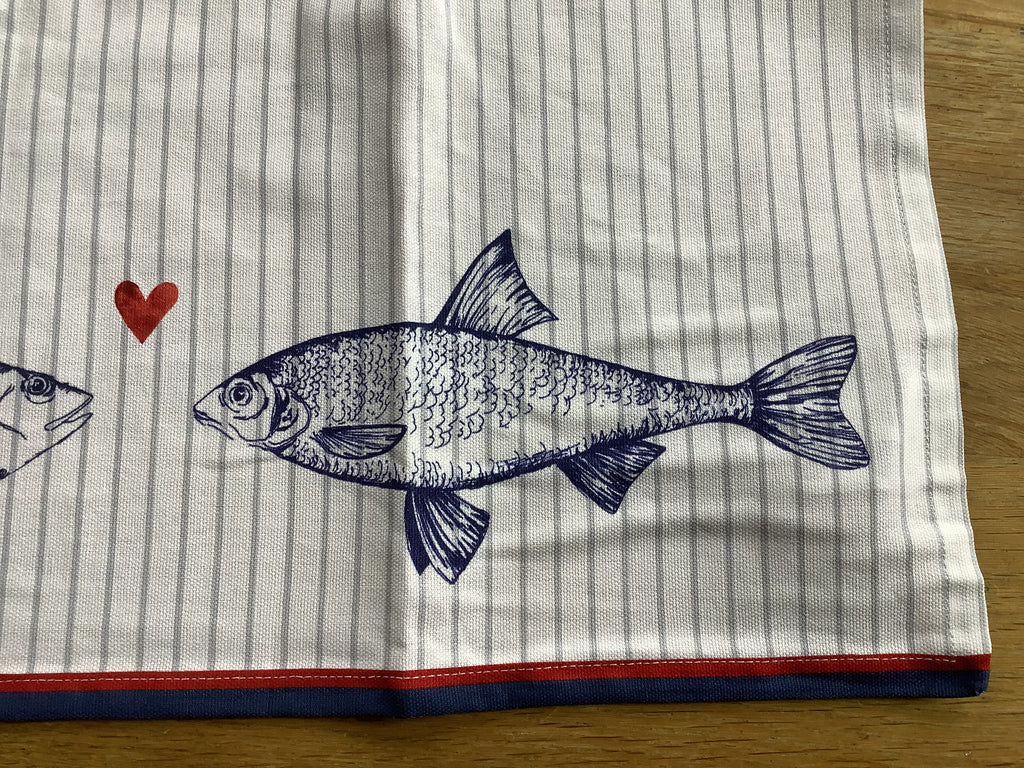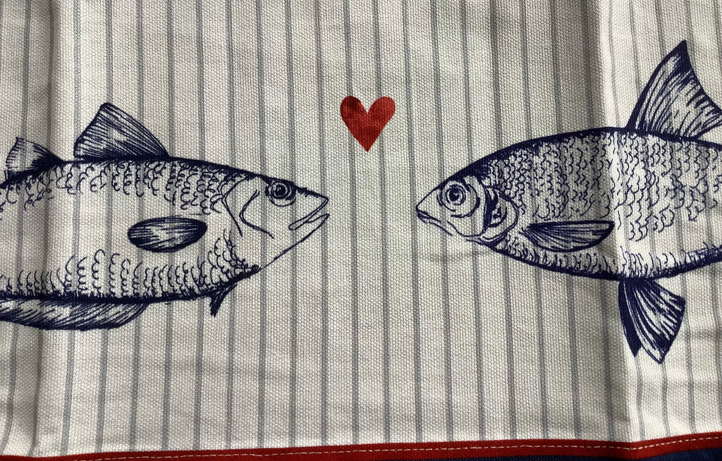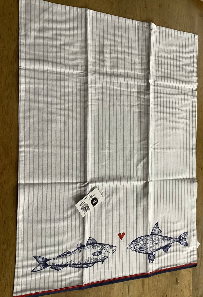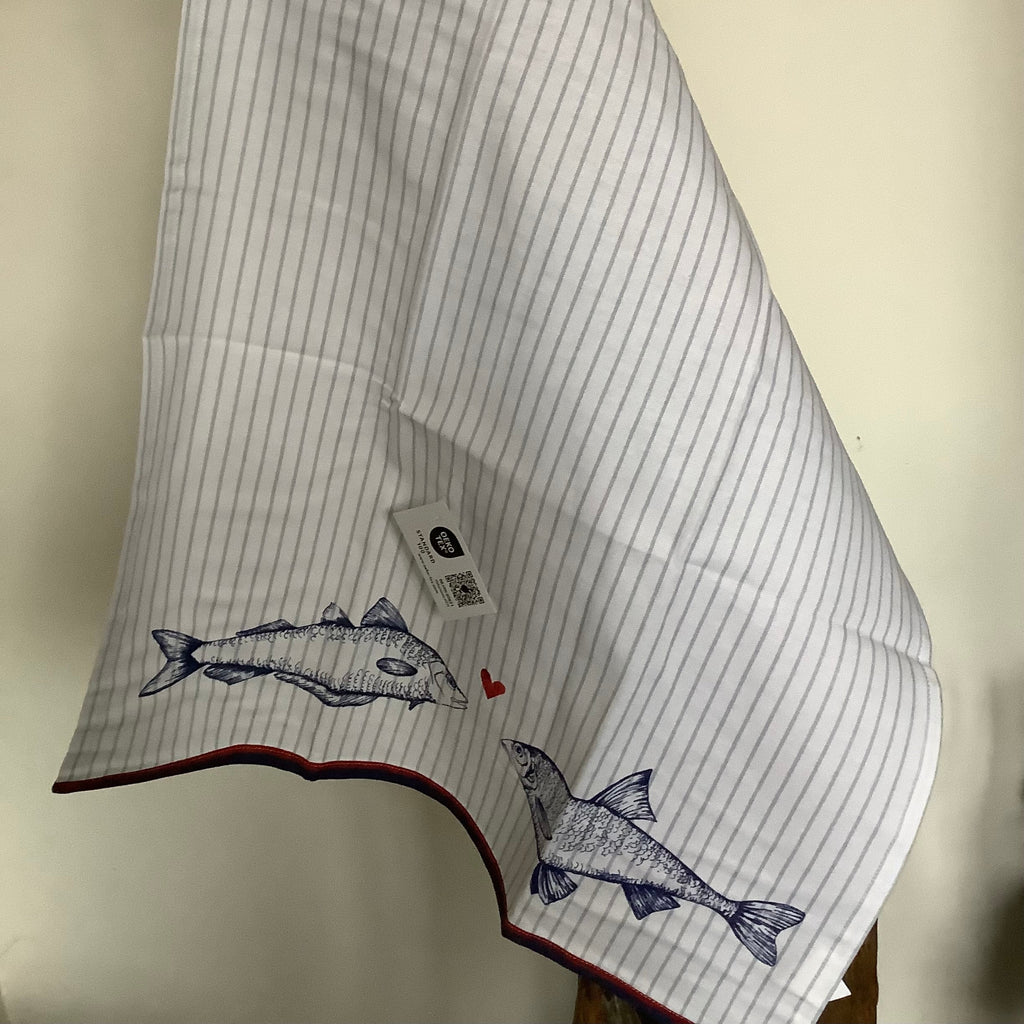 Theedoek in lichtgrijze streep met blauwe kussende vissen,