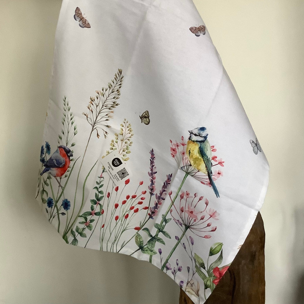 Een vrolijke theedoek met tuinvogeltjes en bloemen.