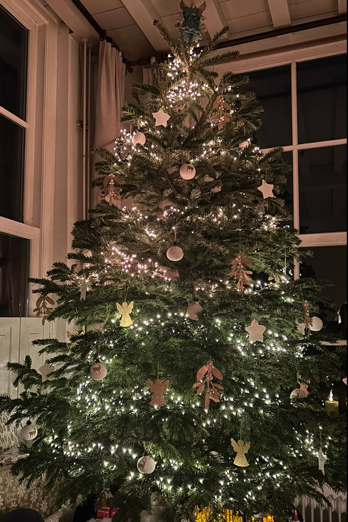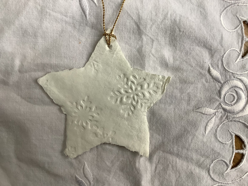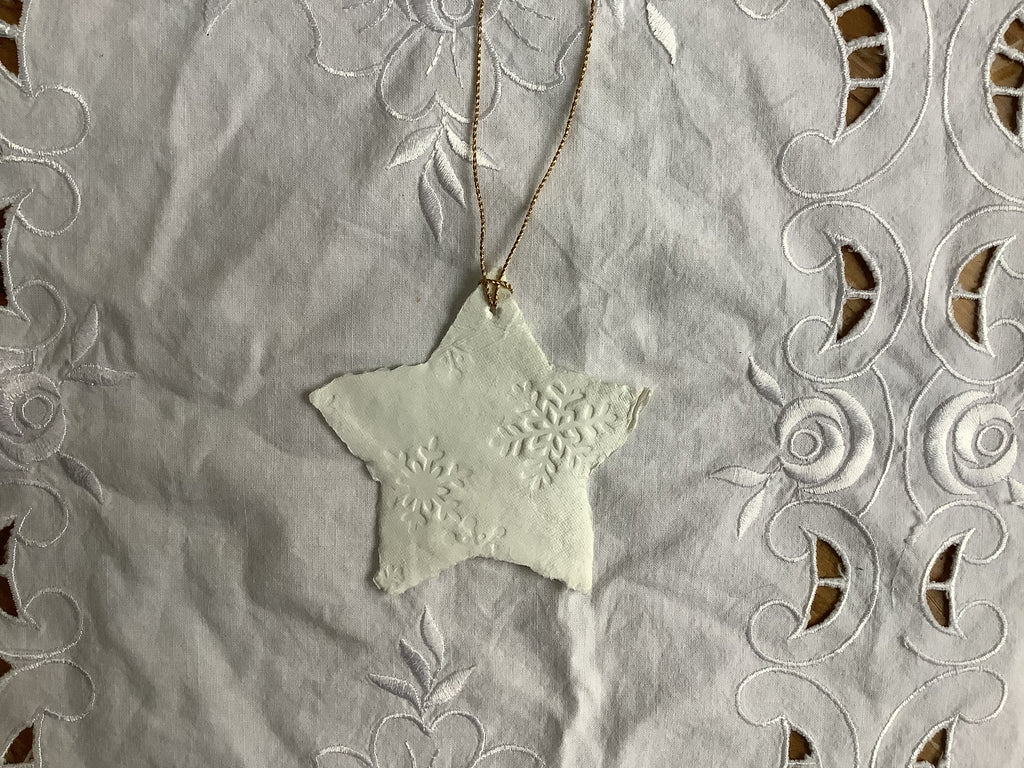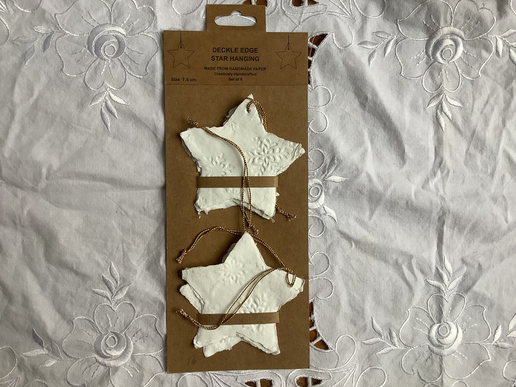 Witte sterren van geschept dikker papier (gemaakt van gerecycled katoen)met gestanst patroontje, prachtig in de kerstboom of als gifttag.